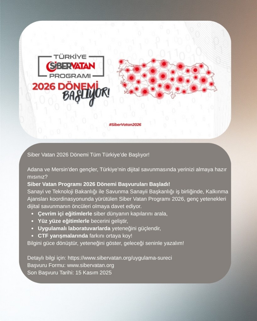 Siber Vatan Programı 2026 Dönemi Başvuruları Başladı!Sanayi ve Teknoloji Bakanlığı ile Savunma Sanayii Başkanlığı iş birliğinde, Kalkınma Ajansları koordinasyonunda yürütülen Siber Vatan Programı 2026, genç yetenekleri d